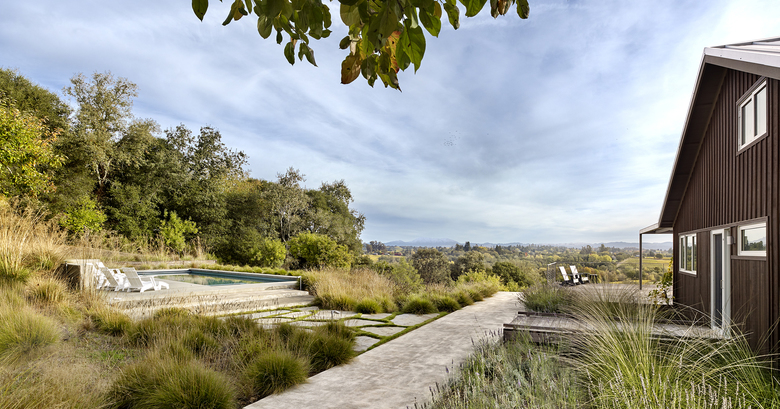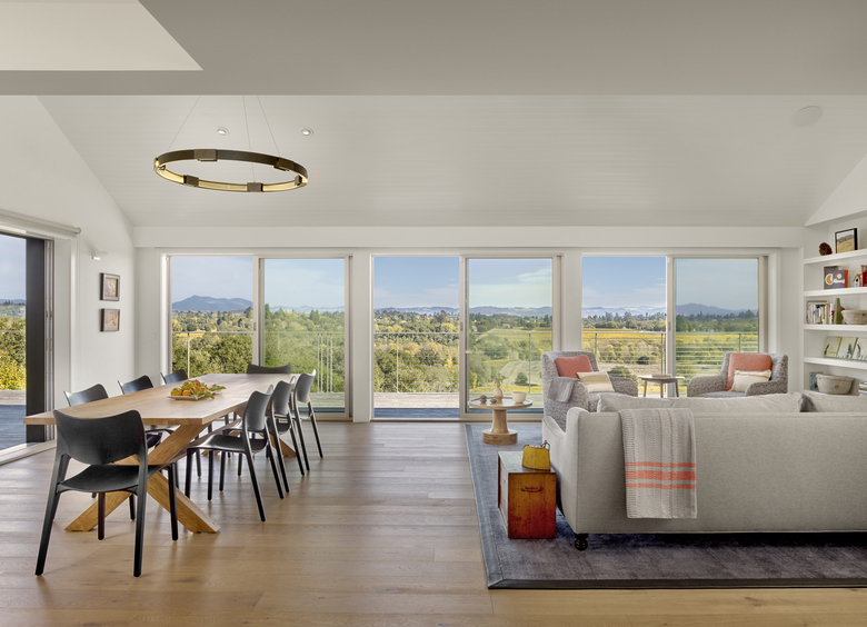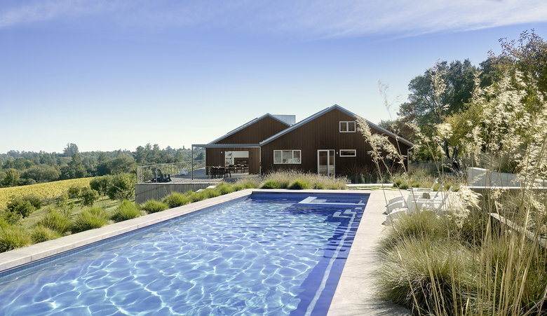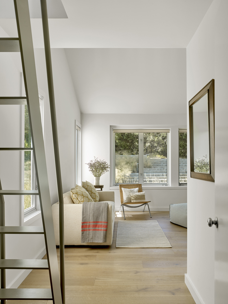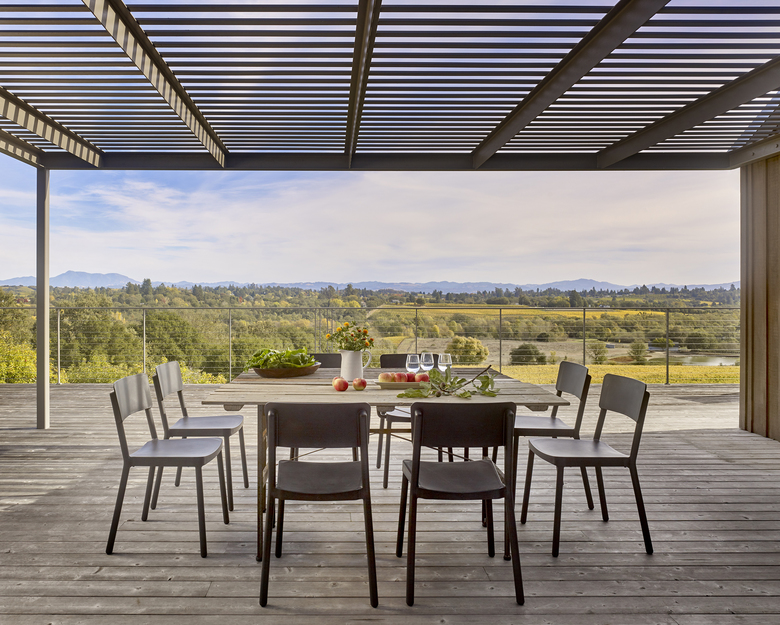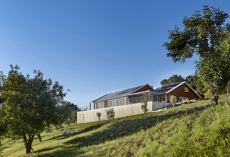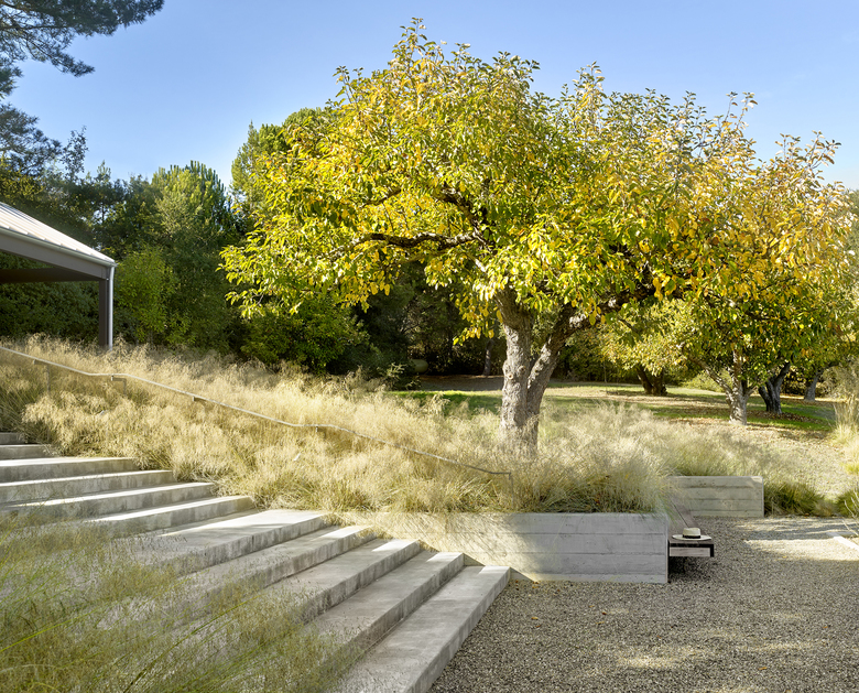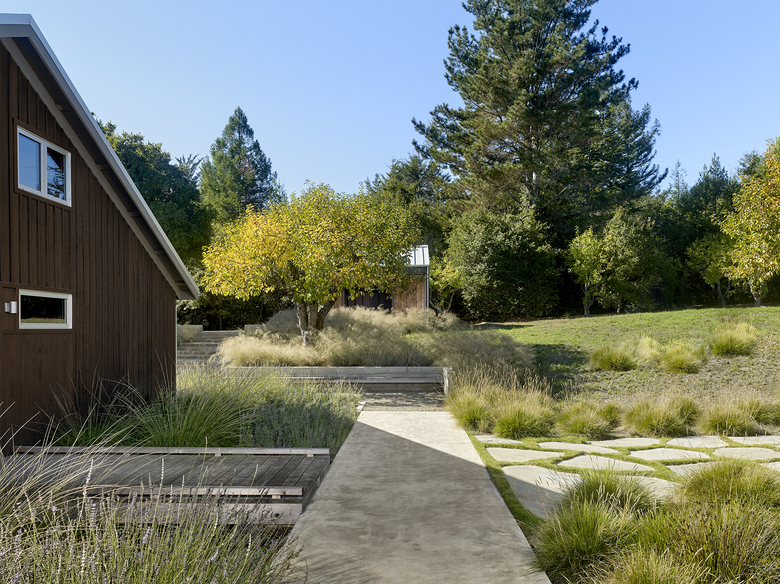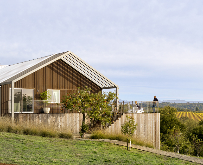 Orchard House is the transformation of a tired, 1980's contemporary house into a modern, sustainable interpretation of vernacular agricultural design. The massing is direct and reductive, with familiar geometries from both utilitarian and modern forms. The elongated gabled volumes sit atop a wood plinth and merge with the site through steel trellises, bridges, stairs, and landscape interventions. The open trellises, skeletal carport, and weathered decking recall varying states of transformation and renewal germane to an agrarian landscape.