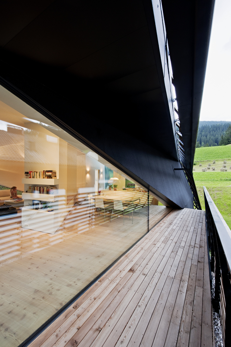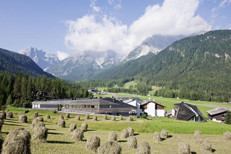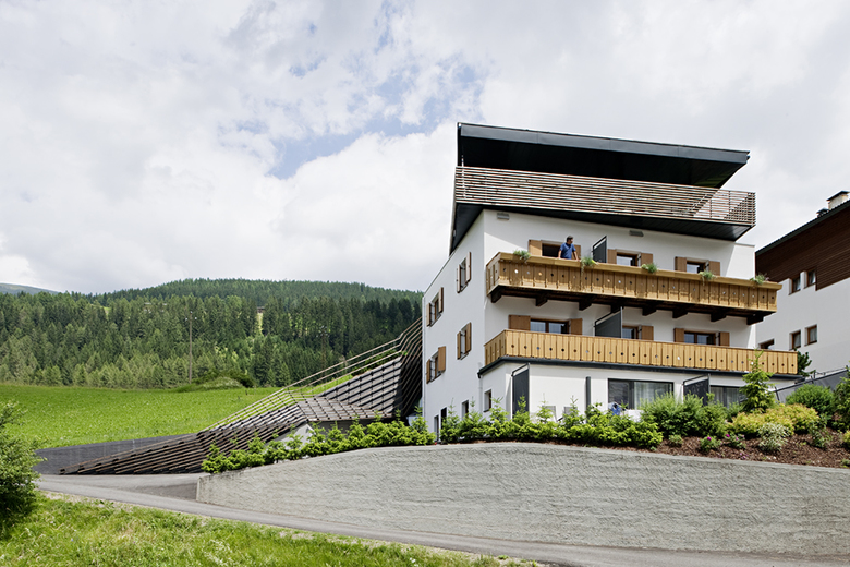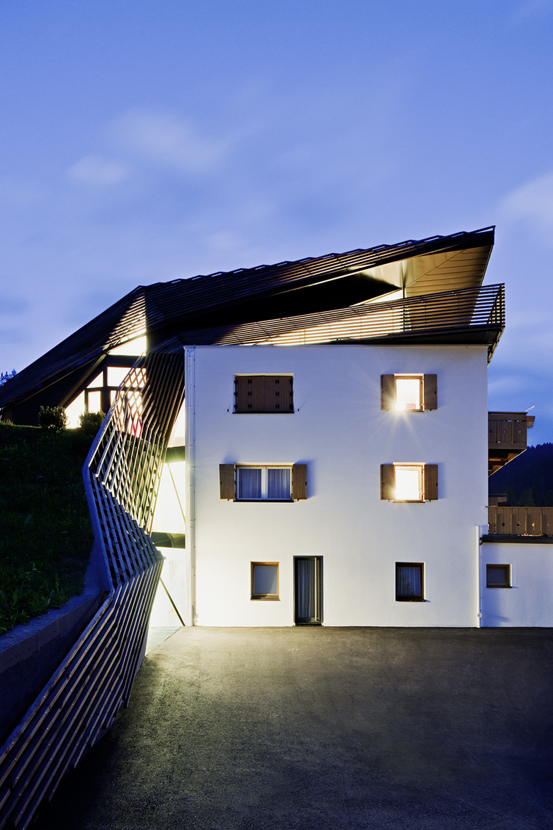 Strata Hotel was completed in 2007: a subtle volume of horizontal wooden larch sticks that peel off the building, run over it, and seem to grow out of the surrounding topography.
