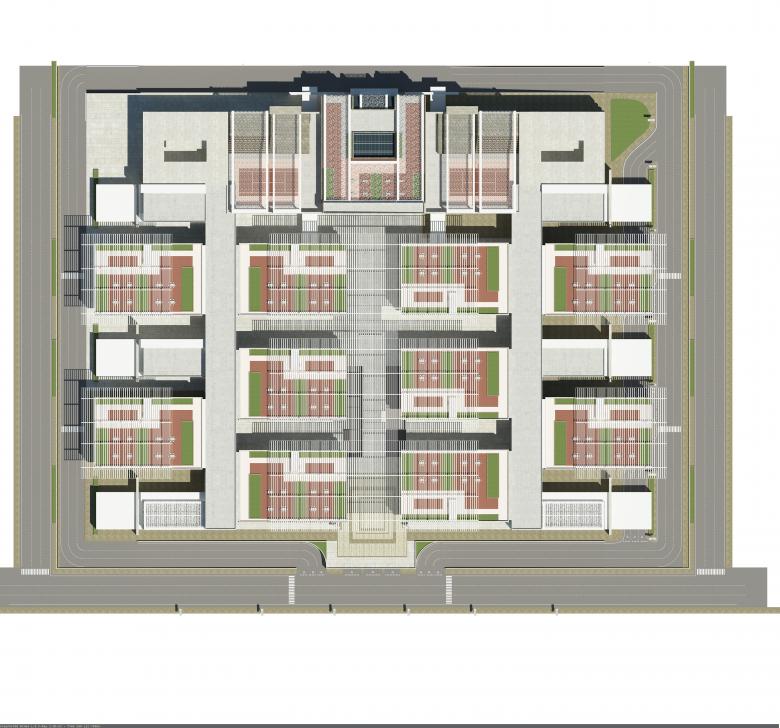 The concept is to organize the entire school based on a podium that is used for bus stations for all students and covered parking. On top of it the school is organized as combination of possible modules that allow to have all possible configuration required from client: for example male school for C1,C2,C3 or male and female for C2 and C3 etc..