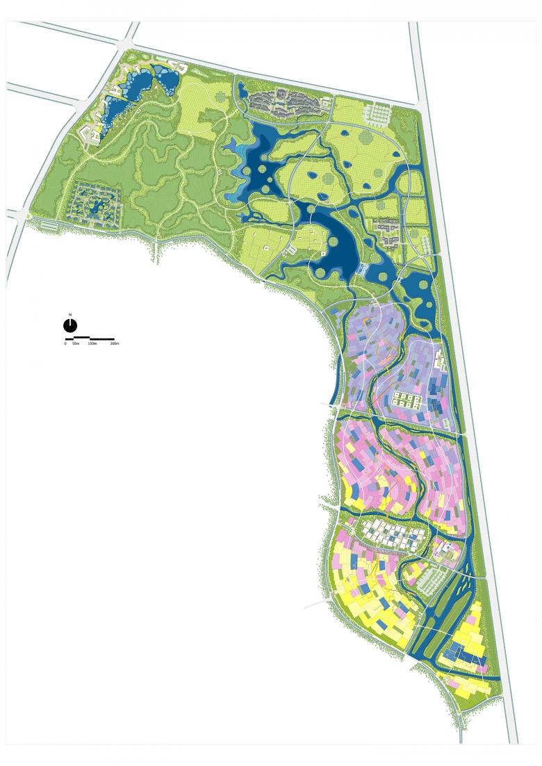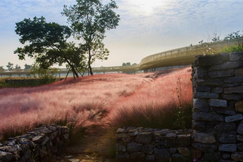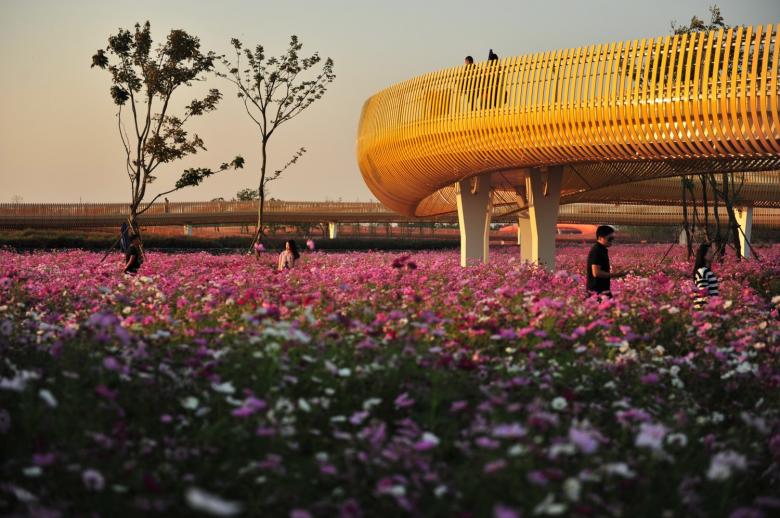 In a new urban development district, a park, called Santai Shan Forest Park, was planned as a catalyst to transform the poorly managed suburban landscape and enhance the land value surrounding the site. The strategy is a patchwork of flowers. The project celebrates the vernacular landscape of fields, orchard, forests and water features in the existing situation. The designer made use of the subtle terrain and has created terraces of fields and transformed them into a patchwork colors of meadows and productive crops. A touring route and a network of pedestrian connect the designed and exiting landscape elements together, and a skywalk is elevated above the filed allowing visitor to experience the extensive fields of colors. Pavilions and resting structure are allocated all through the landscape. In just 5 months after its opening from May till October of 2015, two millions of visitors had been attracted to the park. The goal of creating an activating the suburban district through an inexpensive landscape strategy has been fulfilled successfully.