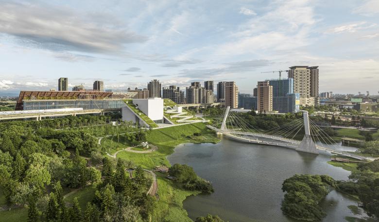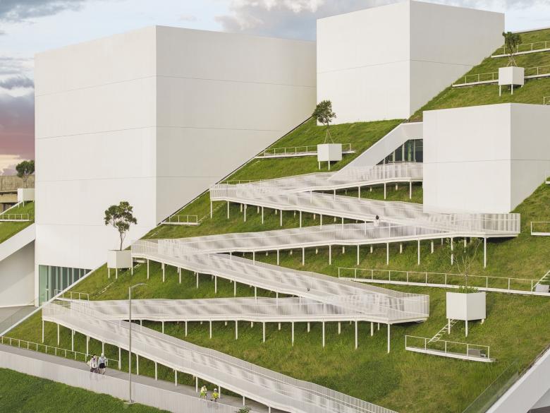 Taoyuan Museum of Art is divided into two buildings: the art museum building and the childrens museum building, both designed in consideration of the relationship with the surrounding environment.To the south is a residential complex built by a private developer as a mini-development, and to the north are a forest and a lake rich in nature. The surrounding ground is raised to form a hill-like slope with ramps and pergolas to host park-like activities.With a 30-degree incline, the hill has several holes that form terraces from where people can enter as if crawling under the roof. Tucked between the roof and the interior exhibition rooms are rich spaces by terraced various activities such as cafe and library. The museum can be enjoyed while always feeling the relationship with the outside.