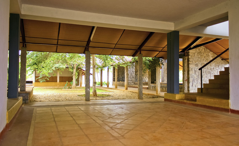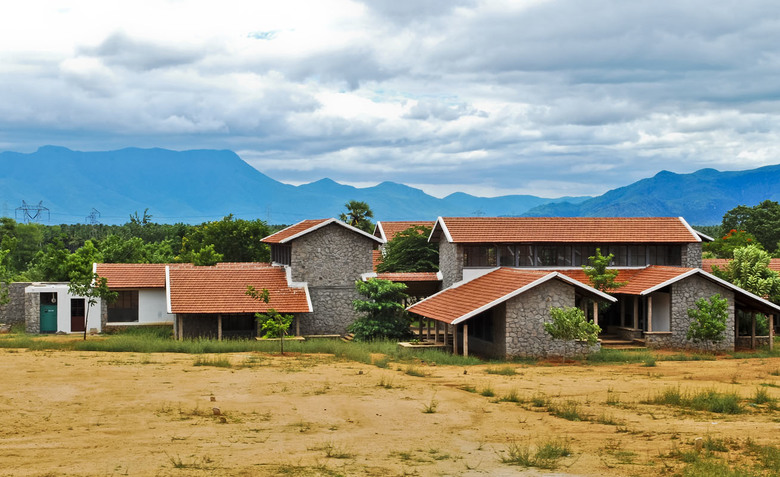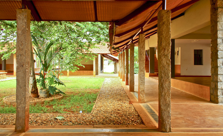 The site had some legal constraints disallowing building on certain portions, which necessitated fragmenting the layout into three components. The site plan picks up on the way villages are distributed across a region, with clusters from which interconnecting roads spring out. The individual clusters grow as radiating squares and interlocking courtyards. Halls sided with verandahs open onto landscaped courtyard maintaining transparency along one axis of every space. The vocabulary of tile roofs, random rubble stone walls, stone columns, bright cement oxide floors, and reed mats render the complex as a subtle yet striking composition of shade, light and color, interwoven with landscape.