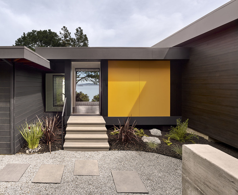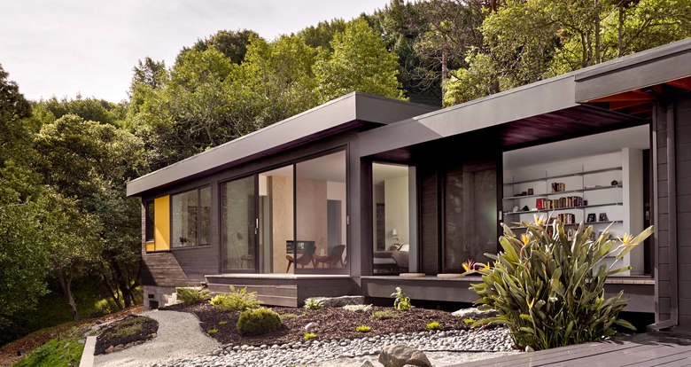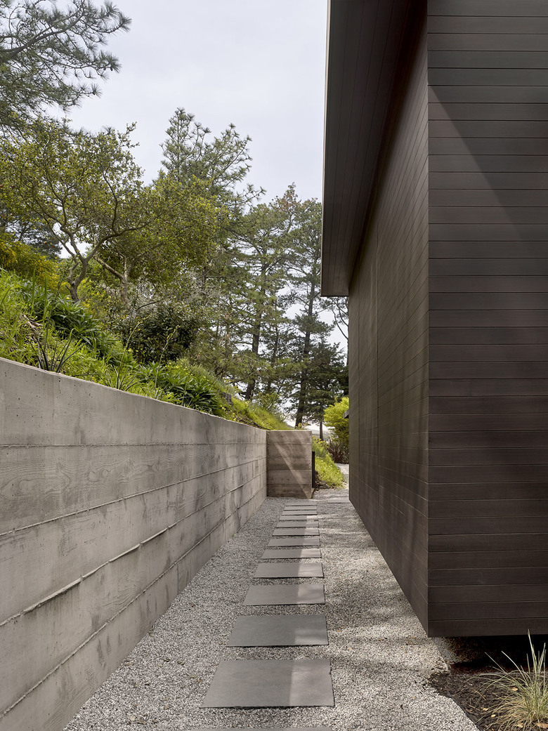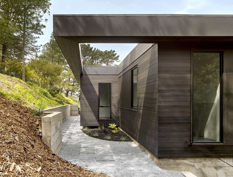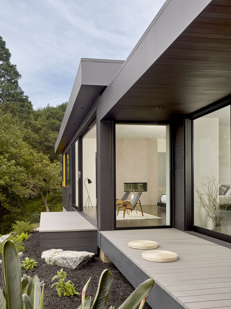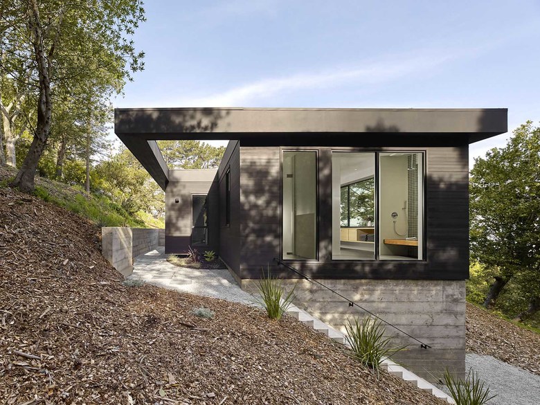 Teaberry is a master suite addition to a simple, single-story mid-century house. The owners dreamed of a modern retreat immersed in nature. Teaberry sits on a wooded site with spectacular views of the northern San Francisco Bay. The addition telescopes eastward from the existing house, mediating and modulating the hillside topography.