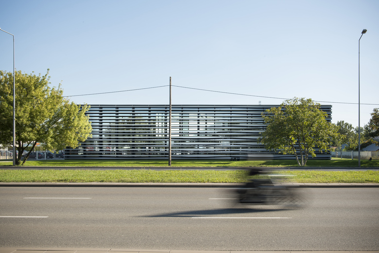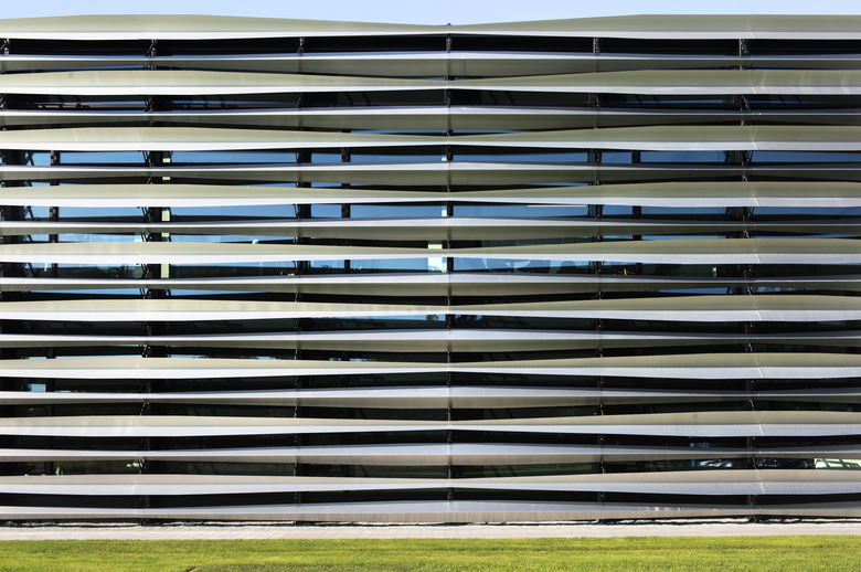 As if wanting to tell a story about the inner workings of the building, gleaming stainless steel fins cover the façades of the new Trumpf Poland Technology Center in a soft gradient. Produced from high-grade sheet steel, the fins are laser-cut and folded to widen and narrow over their 10-meter length — a direct architectural application of the machine tool- and laser technology for which the company is known.