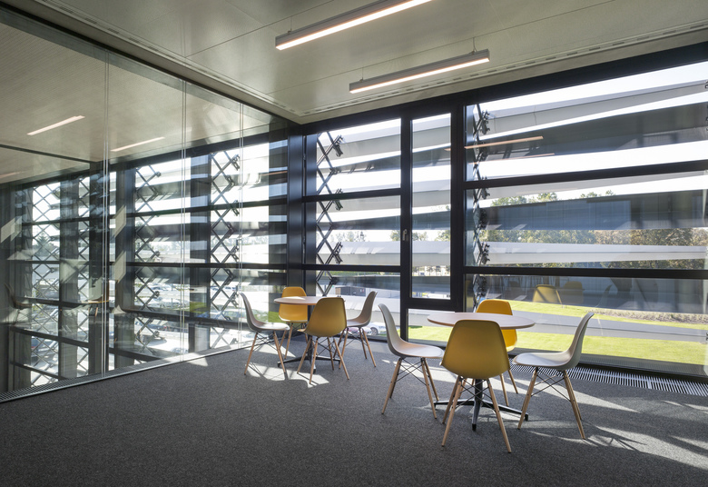 Both the interior and exterior of the building are characterized by an economic use of industrial materials. The courtyard roof garden is bordered towards the showroom with U-profile translucent thermally insulated glass, and the load-bearing structure is left visible from within the building. In the office area, where the cores and emergency staircases can be found, the frame has been executed in solid reinforced concrete, while the double-height open area is constructed with a black-painted steel skeleton. Beyond creative and aesthetic concerns, another advantage of this design was the quick, twelve-month construction time it enabled.