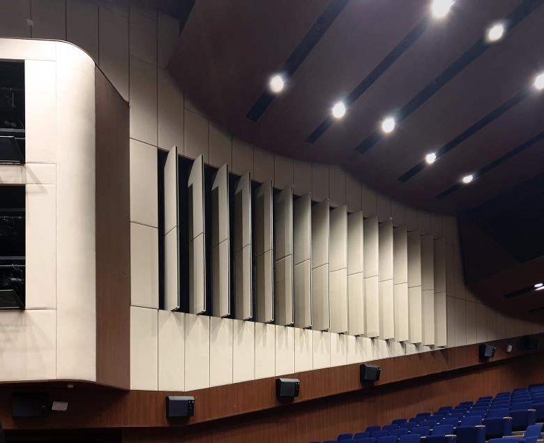 The rotating system panels controlled by software allows to vary the acoustics of the room: going from a situation of sound absorption typical of cinema halls, to a situation where the walls reflect the sound like in a concert hall and a theater.