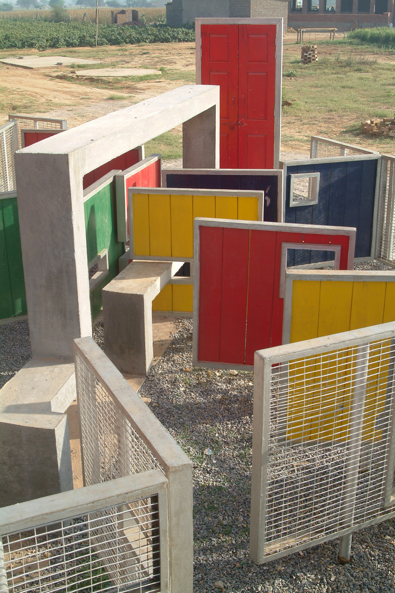 This playground is – for the children as much as for the design team – an act of irreverence towards all that architects deal with in our everyday life. The concrete band running diagonally through the playground is simultaneously a path and a diagrammatic sliver of a home which starts at the green door with a front courtyard (a public space) transforms into a bench and then as it moves towards the center of the playground, it hints towards an identity that could be wall, a roof, a bed (a more private space) and so it moves onto the rear courtyard (a semi-public space).
