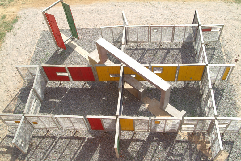 We approached the creation of the playground a story where the children could redefine the storyline through the kinetic dynamics of the playground each time they engaged with it. A playground that was as dynamic as the games that unfolded on it. The playground was seen as the canvas on which a child could unlock new worlds – different from the fixed spaces determined by adults in her day-to-day life. Although the playground we created is potentially ever changing in its structure – there is a formal structure to the space within which the moving parts define possibilities. It is placed on a regular grid of pivoting panels, set on a squared gravid pit with a diagonal undulating concrete path running through it. The path starts on the ground, then elevate into space before coming down again.