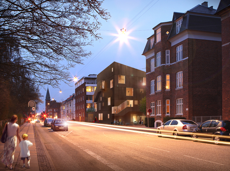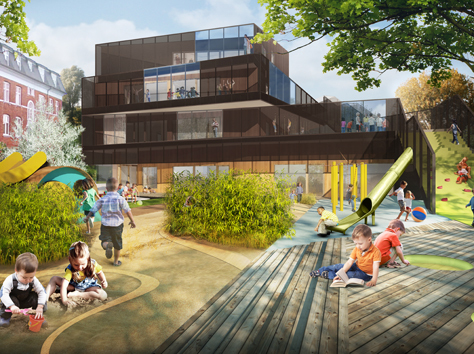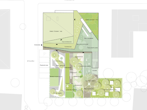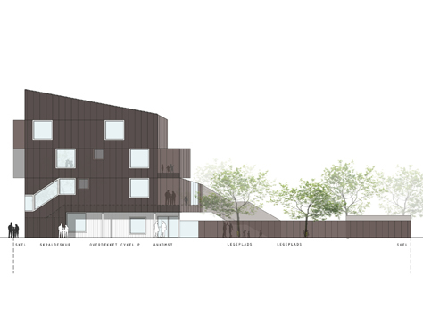 Outside the ground level playground and the “sky-workshop” at the 4th floor are connected by a continuous playground, made up by offset plateaus, terraces, stairs and slides, folding up and creating outdoor spaces on all levels. The inner connection is an intimate staircase, winding upwards in a spiral movement ending in a top light. Travelling this stair case to the top of the building, one passes various windows and niches with views of the city life below. The facades and windows are shaped in regard to views, daylight and spatial qualities within each room, while the footprint of the building is adjusted to functional and technical needs.