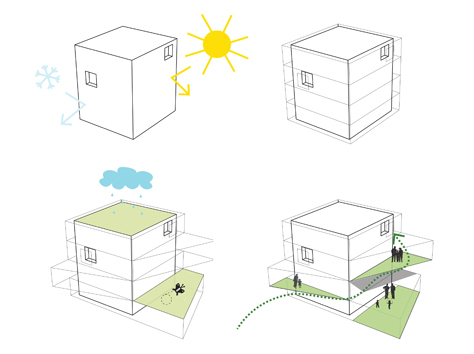 The sustainable strategy of the building starts with a rational concrete structure, wrapped in a comforting and protective skin/screen which can be freely detached from its core in order to create sheltered outside spaces, sun screening, enclosed stairs and storage. The tone of the skin aims to integrate with the surrounding historic brick buildings.