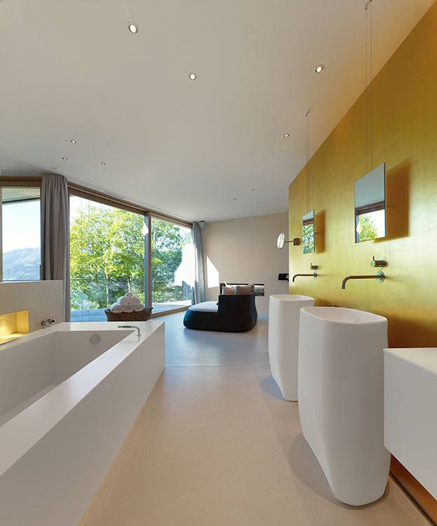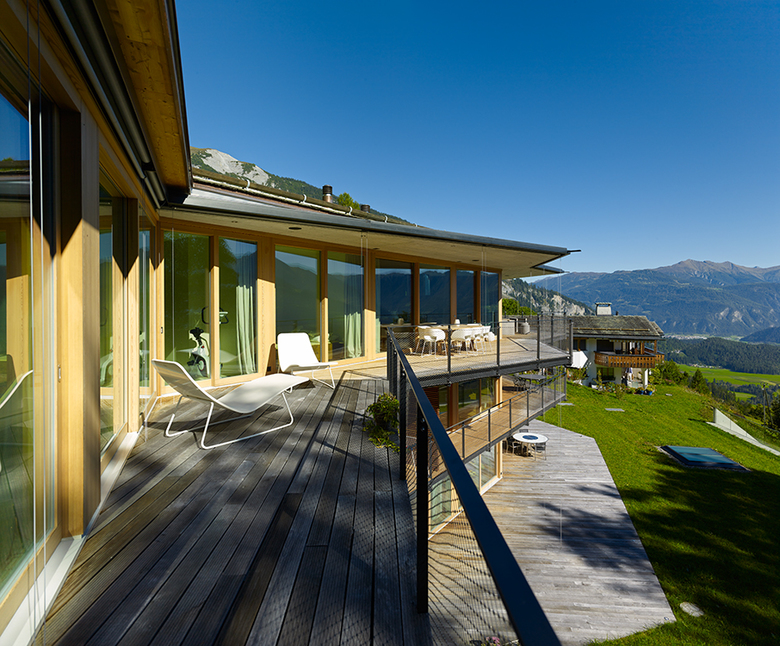 Naturholzfenster bilden einen Kontrast zu dem harten alpinen Material und schaffen vor allem im Innenraum eine wohnliche Atmosphäre.