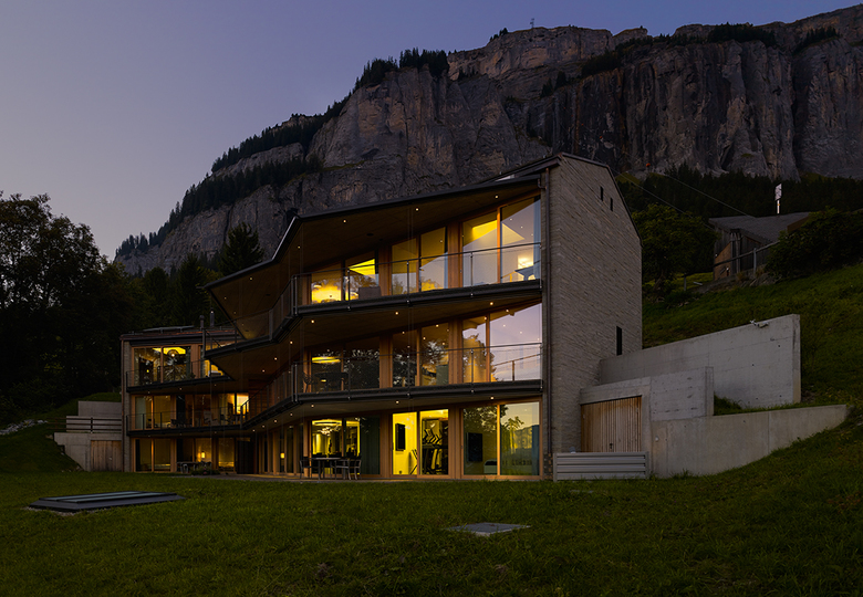 Im Norden bildet die massive Fassade mit einer rauen Natursteinoberfläche einen Schutz gegen den Hang und die Strasse.