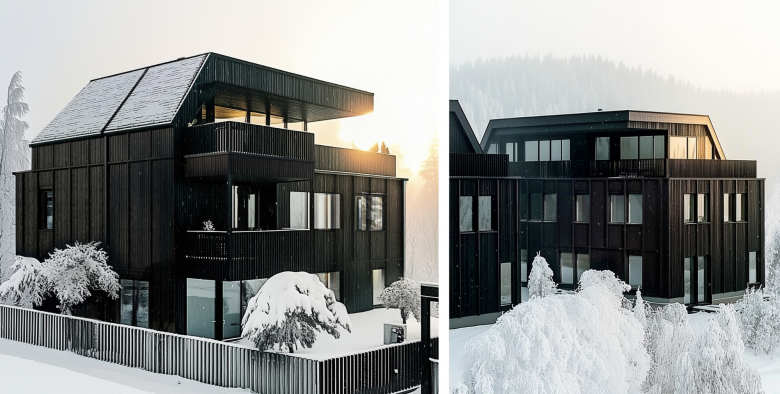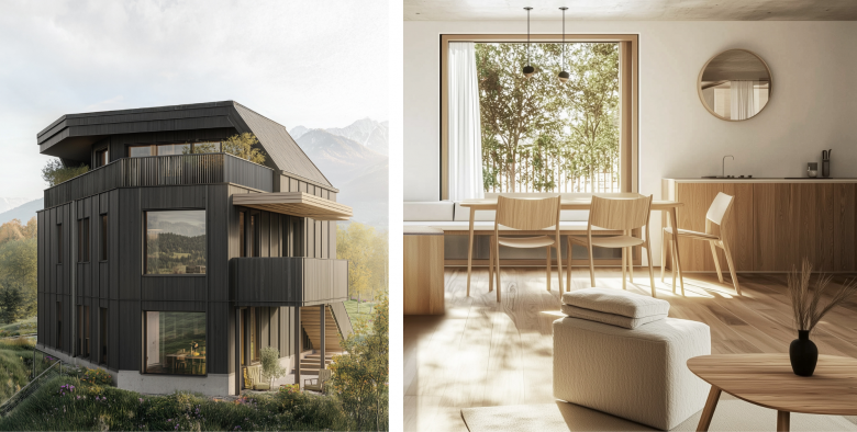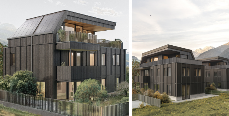 Three elegant Stadtland villas combine urban luxury with rural idyll. Their striking appearance - a powerful concrete base combined with a dark wooden façade - embodies the symbiosis of classic elegance and a modern interpretation of traditional architecture. The sustainable timber construction and the individual heat pumps in each apartment underline the concept of autonomy and ecological responsibility.