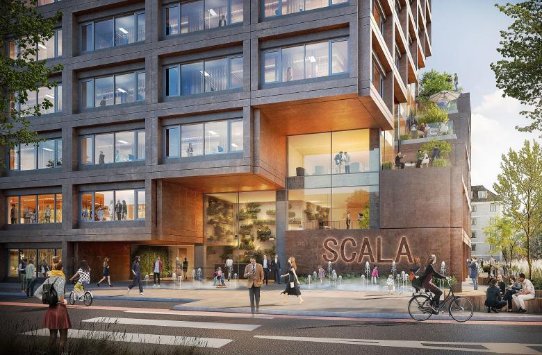 Auch im Innern des Gebäudes setzt sich das Grünkonzept mit prominent platzierten Grünwänden im Erd- und ersten Obergeschoss fort. Neben flexibel aufteilbaren Büroflächen verfügt das Scala über Gastronomie im Erdgeschoss mit großzügiger Südterrasse und einen Konferenzbereich im ersten Obergeschoss.