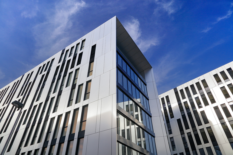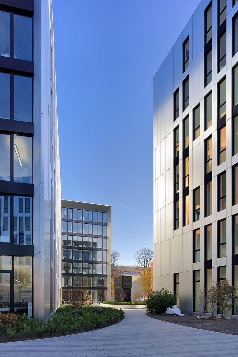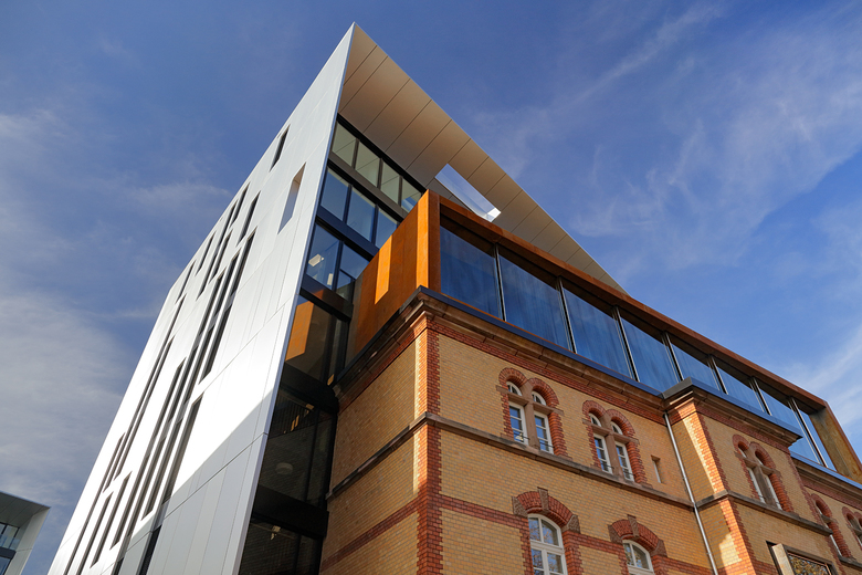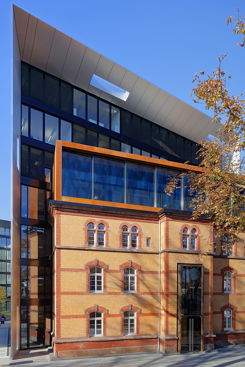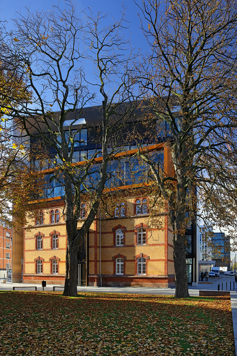 On a corner plot of the former Uhlan barracks in the Derendorf district of Dusseldorf stands the building ensemble Clara & Robert, by sop architekten, which links the two new buildings with the historical Saarhaus. The Wilhelmine barracks, erected in 1890 and currently among the largest remaining barracks facilities in the Rhineland, were given new life through comprehensive renovation and expansion. The Clara & Robert office complex builds on the location’s architectural history, while the preservation of the expressive Saarhaus, which is being integrated into one of the new buildings, restores the link to the former barracks. The name and inspiration for the two angular, interlocking, L-shaped buildings, which boast around 16,800 m2 of rentable space, were the composer couple Clara and Robert Schumann, who lived in Dusseldorf in the middle of the 19th century. The vertical slits in the polished natural aluminium building envelope recall old perforated-metal music discs used to record sound for mechanical musical instruments around the beginning of the last century. The material’s matte shine lends the façade a discreet reflective quality, allowing the changing light conditions to project a myriad of different moods onto the building. The largely visible yellow-brick façade of the historical Saarhaus is framed by the protruding shell of one of the new buildings. A monolithic Corten steel box, the colour of which samples the old brick, contrasts while expanding the old building by two storeys, thereby establishing architectural relationship with the new complex. The resulting flat-roof construction offers space for attractive rooftop terraces. The main entrance areas are fronted with an expansive glass façade. All window installations are furnished sun-screening systems. Both 7-storey office buildings possess a flexible floor-plan structure, which guarantees the integration of variously sized rental units. The office space is variably divisible on all floors, and can accommodate all conceivable types of tenants, from individual and group offices to combined-use zones and open spaces. The underground levels, which link the two buildings to one another, are used for technical facilities, storage and a car park with around 300 parking spots. The grounds around the building have been intensively planted and provide space for fully paved access routes and generous driveways. The property’s existing trees that were able to remain were integrated into green islands, emphasising the history of the location. Location Dusseldorf Derendorf Developer die developer Projektentwicklung GmbH Team Jurek M. Slapa, Jürgen Kowald, Daniel Kohlmeyer, Frank Ostrowski, Irene Lening.