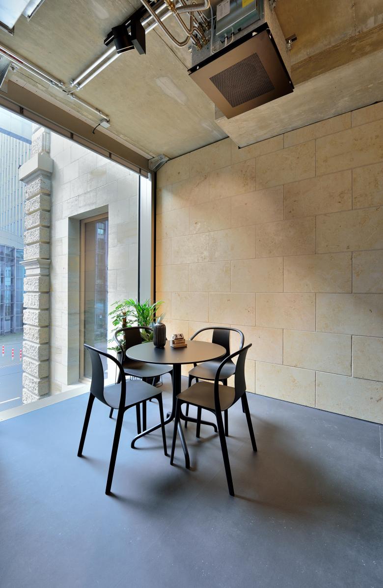 The double-storey foyer offers 500m² of public space for encounter and exchange. A bar, lounge and seating area conceived by Design Offices are available to tenants and guests for informal meetings and as a working and breakout space. The restaurant on the ground floor is accessed via a separate entrance on Friedrichstraße. The side entrance on Fürstenwall features a mural relief sited to be visible from the outside. Along with various other retained elements inside the building, it serves as a reminder of the original structure.