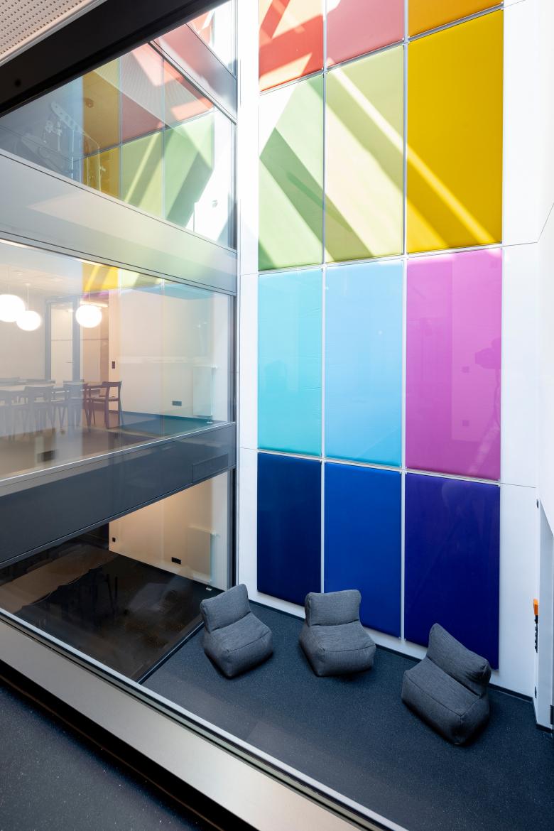 Zwölf Paneele reichen von knalligem Pink über hellem Grün bis zu tiefem Orange und verleihen den zum Atrium hin ausgerichteten Räumen in jeder Etage ein sehenswertes Farbspektakel. Die akustisch wirksamen Paneele sind mit den gleichen Stoffen des 2017 entstandenen Mack-Farbturms bezogen und holen seine leuchtende Farbigkeit ins Innere der Akademie. Der Farbturm, der im Rahmen einer Ausstellung zunächst in Düsseldorf stand, befindet sich seit Ende 2018 vor dem Lehrgebäude der Textilakademie.