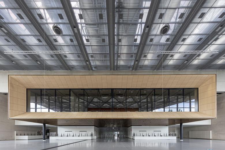 Über das Foyer kommt der Besucher direkt in die neue, rund 12.000m² Ausstellungsfläche umfassende Messehalle. Die rund 15 Meter hohe Halle mit transparenten Hubtoren ist stützenfrei, kann komplett abgedunkelt und geteilt werden, und ist damit hochflexibel und multifunktional nutzbar.