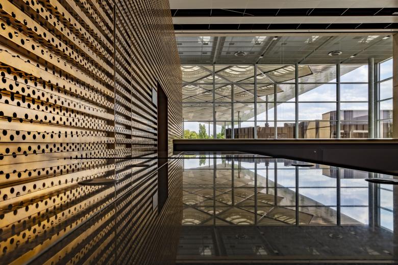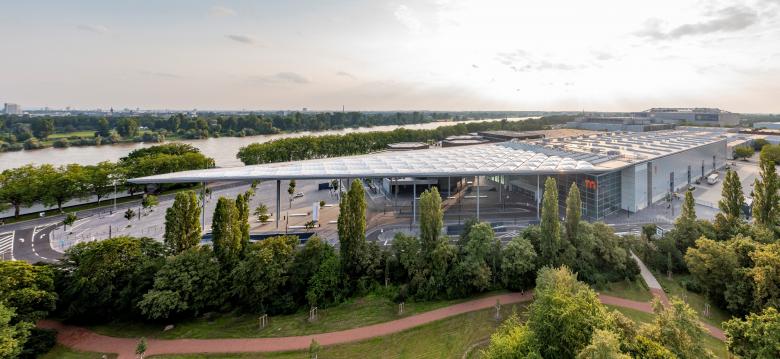 Mit einem rund 7.800m² großen, transluzenten Vordach verleihen sop architekten der Messe nicht nur eine bereits vom Wasser aus, weithin sichtbare Adresse. Vom repräsentativen Messevorplatz mit Taxivorfahrten, Bushaltestellen, Fahrradstellplätzen, Ladestationen für Elektromobilität und tageslichtdurchfluteten Zugängen zu einer großzügigen Tiefgarage, über den transparenten Südeingang mit flexiblen Konferenzflächen bis hin zur multifunktionalen Messehalle 1 vereint das 20 Meter hohe Dach alle Funktionen unter sich. Gleichzeitig integriert es die bestehende Architektur des benachbarten Kongresszentrums und stellt durch zusätzlich angelegte Grünstreifen und mehr als 40 neu gepflanzte Bäume, die auch unterhalb des Vordachs verlaufen, fließende Übergänge zwischen Rheinufer und Nordpark her, die Messebesuchern zukünftig als Erholungszonen im Grünen dienen.