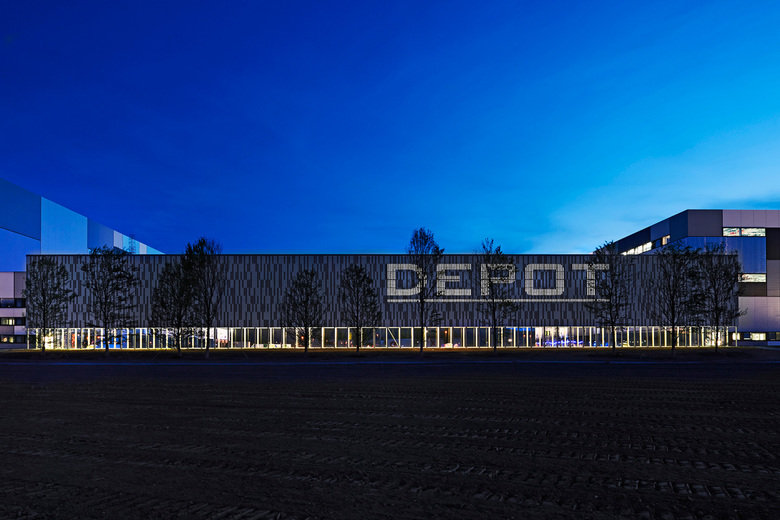 Aufgabe: Planungs- und Beratungsleistungen Lichtplanung. Computerunterstützte Leuchtdichtesimulation des DEPOT-Schriftzuges zur Bemessung der notwendigen Beleuchtungsintensität unter Berücksichtigung der vorhandenen Materialitäten, Umfeldleuchtdichten und gegebenen Betrachtungsabstände.