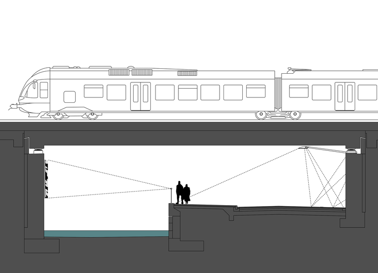 Die Eisenbahnüberführung Weiherfeldstraße in Karlsruhe bietet durch die räumliche Kombination von Strassenführung und Flusslauf, auf der Albseite die einmalige Möglichkeit eine Wandinstallation zu gestalten, die für den Betrachter in einem definierten Abstand erlebbar ist. Gleichzeitig bleibt diese Wandfläche für den Passanten unerreichbar.