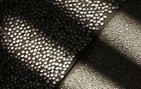 Die Oberfläche wird durch Licht in Abhängigkeit von der Position der Oberfläche, der Lichtquelle und des Rezipienten aktiviert. In einem bestimmten Moment kann die Reflexionswirkung wahrgenommen werden. Die Wandinstallation wechselt von einem passiven in einen aktiven Zustand.