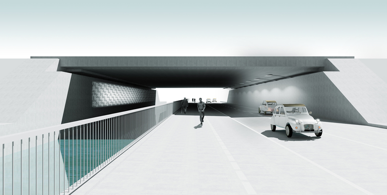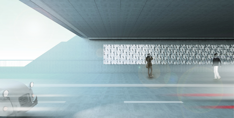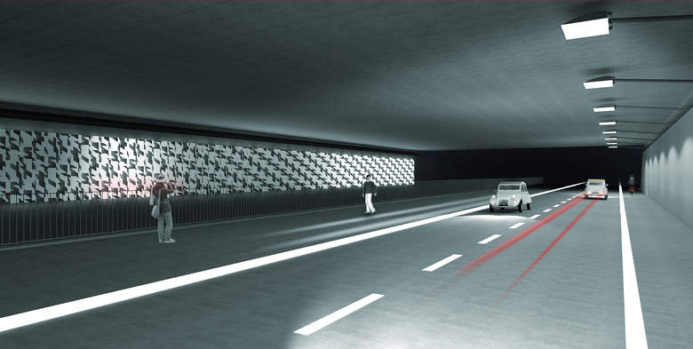 Die Funktionalbeleuchtung für den Straßenverkehr folgt in Anzahl, Schaltung und Technik dem vorliegenden lichttechnischen Fachgutachten. Die Positionierung der Leuchten ist aus Gründen der freien Sicht auf die thematisch zentrale Wandgestaltung und Nutzung der südlichen Tunnelwand als Gesamtreflexionsfläche für einen helleren Gesamteindruck der Raumbegrenzungsflächen an Wandauslegern entlang der südlichen Wand gewählt. Auch hier soll eine kaltweiße Lichtfarbe eingesetzt werden.