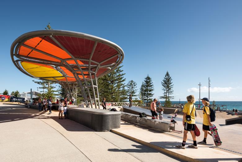 Formerly a carpark, Scarborough Square is a new civic space that sits between the beach and The Esplanade. The square is the primary point of arrival to the foreshore and includes a set of striking shade arbours designed by Perth practice Chaney Architects.