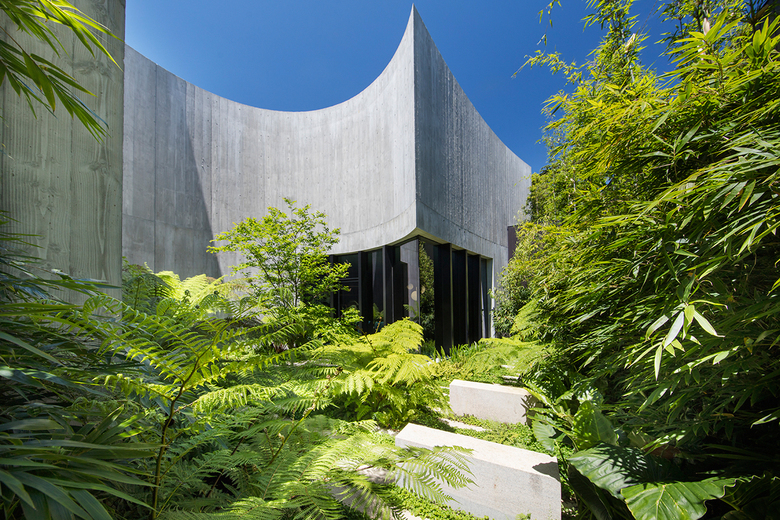 The south side of the house boasts a lush circular fernery nestled between the building walls. An array of layered plantings and a scattering of granite plinths create an exotic atmosphere.