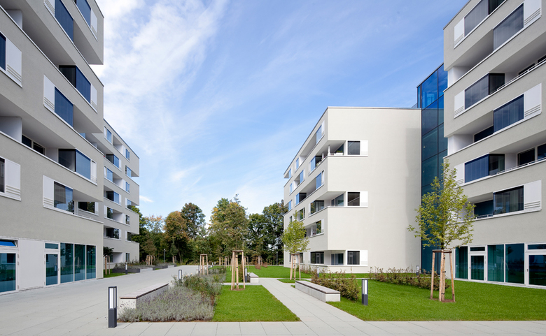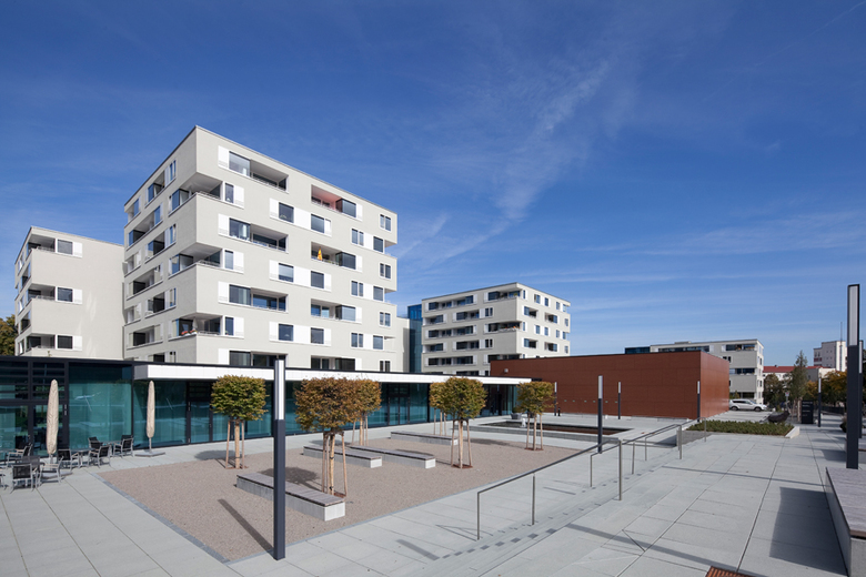 The Augustinum II foundation old people’s home is located on Stuttgart’s Killesberg next to the Weissenhofsiedlung and is thus conspicuous within the topographical and urban structure. 300 residential units of different sizes are fitted into four double towers. The heights of the non-uniform individual structures are staggered, ranging from eight to five storeys and their scale is similar to that of the neighbouring residential development. The residential towers are connected to community facilities via the basement storey, which is stepped to fit in with the terrain. The complex draws back from the busy approach road to the west, while the main entrance faces the quiet service road to the south. The complex’s expansive grounds complement its open character. The loggias for to the larger apartments are offset, lending life to the austere cubes.