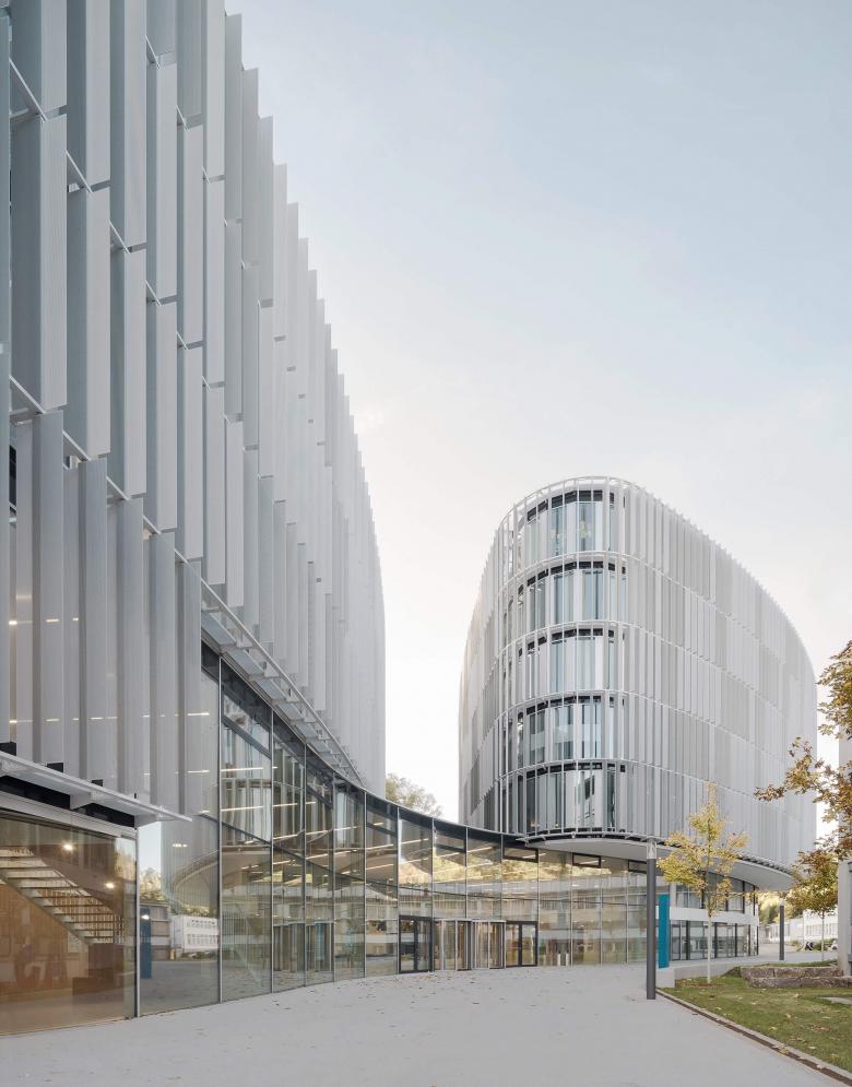 Their glass facades are designed with perforated, rotatable vertical slats in front, which filter the surrounding space. The semi-transparent facades create a unique lighting atmosphere in the inside. The generously glazed lounge areas open outward, taking in the natural environment and creating a distinctly different, new working environment. The property is located in scenic surroundings at the end of a valley north of Schwäbisch Gmünd in Baden-Württemberg. Wooded hills surround the factory site, which is crossed by two streams. The aim of the project was to create a high-quality and modern work environment, both indoor and outdoors, that vitalizes the site as a whole.