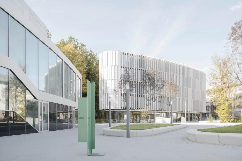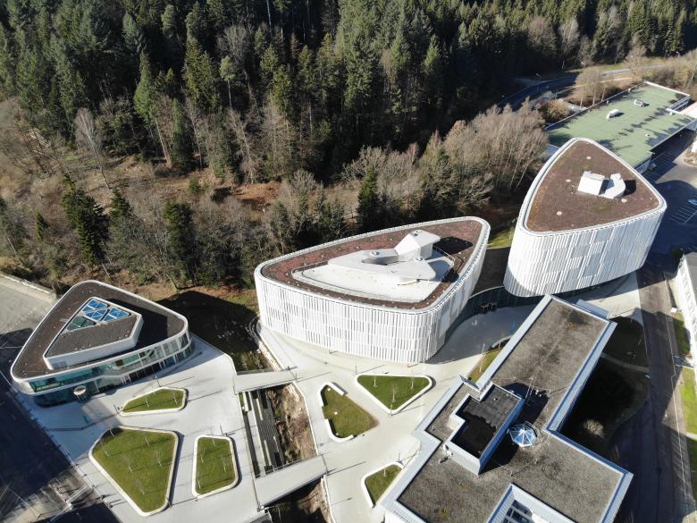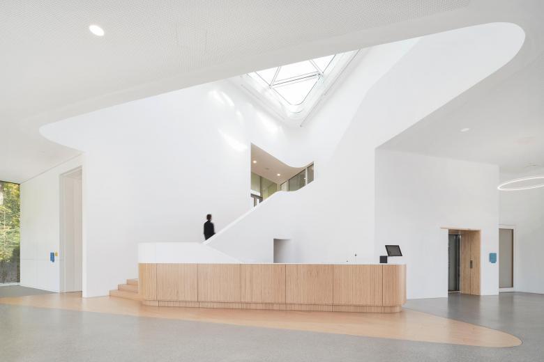 The overall project is divided into three parts: a new customer center, a new reception building, and a parking garage. The spatial and structural reorganization of a portion of the company premises also comprises the renaturation of the two existing streambeds and redesign of the open spaces. The convex curved facades of the reception building and the customer center create space in a visually pleasing and efficient manner with minimized enveloping surfaces. The new structures are integrated into the valley as an organically flowing formation and create a transition to the rationally structured factory site.