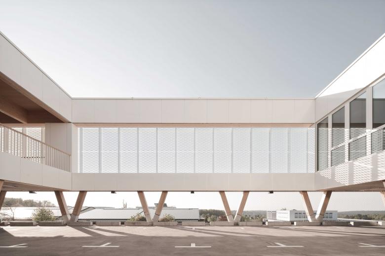 The separation and stacking of the individual functional levels and the use of the site’s sloping terrain are part of the fundamental design concept. As a result, the sealed soil surface could be minimized and, moreover, the building structure nestles harmoniously into the topography. The massive concrete plinth is cut into the slope and the north-facing facade opens to the street. Inside are the garage for the firefighting vehicles and all the facilities required for operations, as well as storage and technical areas. The open-air intermediate level has two atriums and captures the surrounding landscape. It is reached along an external ramp and serves as a parking deck as well as an area for events. Raised up above this is a wooden structure that is wrapped in a homogeneous facade of white expanded metal. It accommodates a classroom, office areas, and other shared spaces. The stacking of the different functional zones is clearly recognizable from the outside, creating a distinctive appearance that establishes a strong identity.
