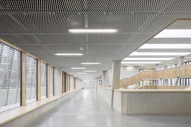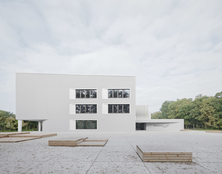 The Hessenwald School is located in a clearing near the village of Gräfenhausen, a district of Weiterstadt (Darmstadt). The new building of the cooperative comprehensive school for around 700 pupils is divided into three pavilion-like structures, which are grouped around a common centre. In the centre of the newly created ensemble, the common areas such as the auditorium, music room and a break hall were created as a large "public centre". This light-flooded, central hall is surrounded by the pavilions, which create individuality and identity for the respective grades.
