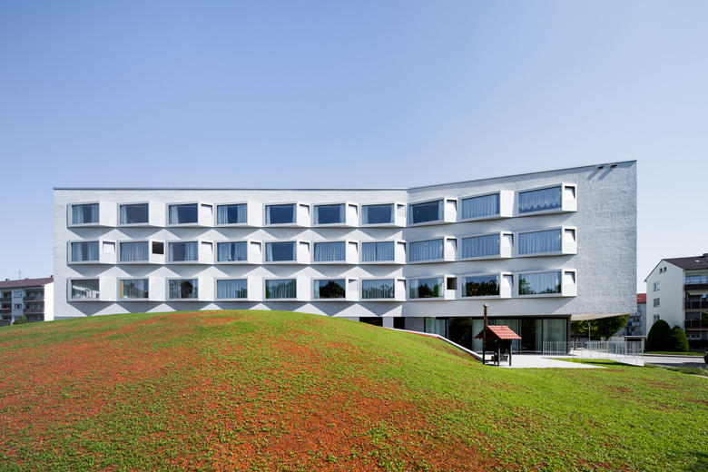 The X-shaped nursing home corresponds to the corridors of the staggered side streets leading directly to the property. This creates a concise spatial setting that forms a protected entrance courtyard and garden courtyard. The added value for the residents' rooms is created by the open bay windows: these not only offer more usable space, they also strengthen the spatial-atmospheric effect inside and step out of the facade in a three-dimensional manner.