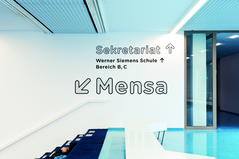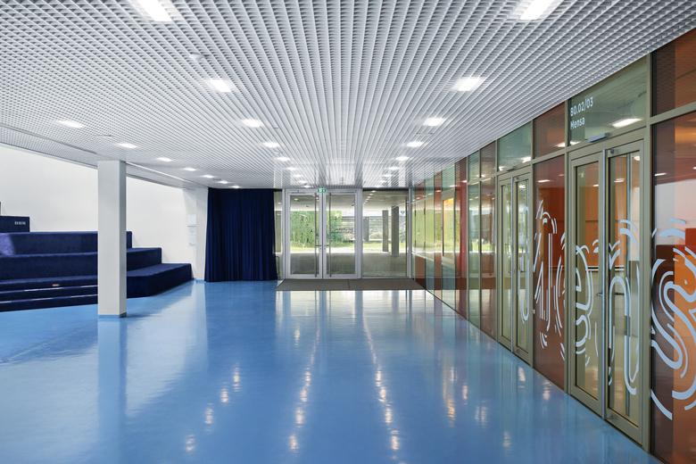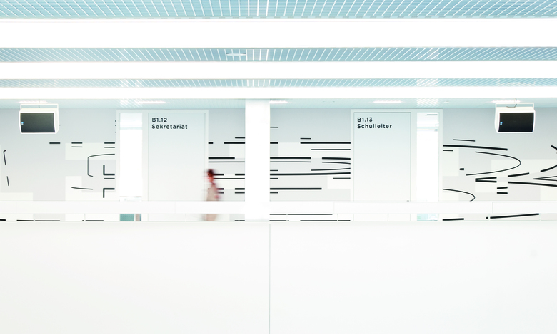 Die Atmosphäre der Innenräume wird vor allem durch die gezielt eingesetzten Farben, das Tageslicht und die grafischen Akzente des Leitsystems geprägt, weniger von einer bestimmten Materialität. Dadurch werden die neu geschaffene Offenheit, Helligkeit und Leichtigkeit der Schule spürbar.