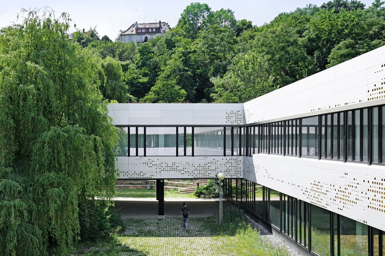 Die Kubatur des vorhandenen Gebäudes wurde nur unwesentlich verändert. Auch die Erschließungen konnten weitestgehend beibehalten werden. Das Schulzentrum wird vor allem über seine klare horizontale Gliederung inmitten einer natürlichen Geländemulde wahrgenommen. Diese Charakteristik wurde gestärkt: Die zurückgesetzten verglasten Flächen mit schwarzen Profilen und die Deckenrandbekleidungen aus gelochten Aluminiumplatten betonen die Schichtung der Geschossebenen und die Horizontalität der Fassaden.