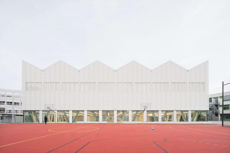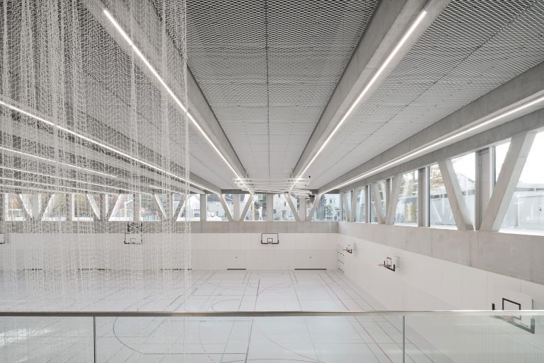 The sports center has an elegant appearance thanks to the freestanding building’s facade of white expanded metal. The distinctive folded roof gives structure to the built form and establishes ties to the neighboring, smaller-scale residential buildings. Thus it fits into the surrounding roof landscape while simultaneously forging a distinctive identity. Inside, the dominant materials are exposed concrete and white expanded metal. Generously dimensioned glazed openings let ample daylight into the building and help create an amenable indoor environment.
