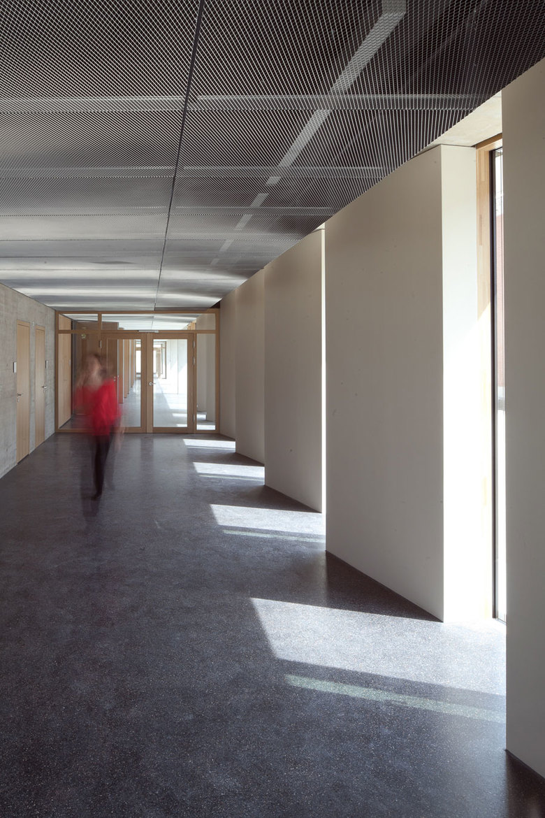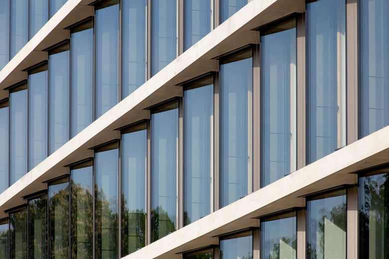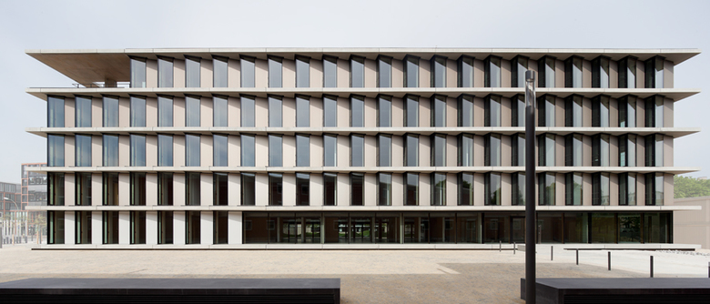 The double-loaded arrangement of the offices is accessed from a corridor running all the way round. The offices themselves are all designed for two people. The façades are developed as vertical relief enlivened by its three-dimensional quality and the alternating glazed and aluminium surfaces, increasingly tinted towards the top.