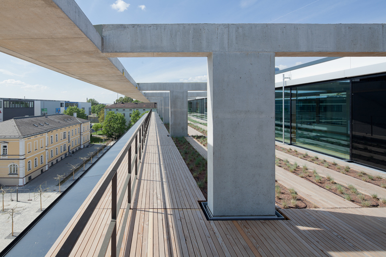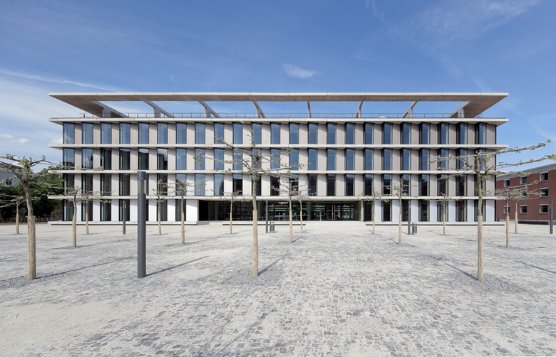 This administration building with offices, communal facilities such as cafeteria and training area for about 400 employees is in the immediate vicinity of Landshut old town. In front of it is a traffic-free forecourt that acts as a distribution area for the entrances to the adjacent office buildings. The building is in the courtyard style, and essentially has five storeys: a recessed section in the foyer area, roof loggias facing south and towards the old town and the detachment of one office section on the main access side for lavish vertical access are staged as subtractive interventions into the building volume. The transparent foyer makes visual contact possible between the forecourt and the inner courtyard. The latter is not open, and with its amorphous forms it represents the central internal reference point as a hortus conclusus.