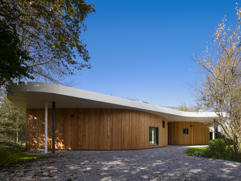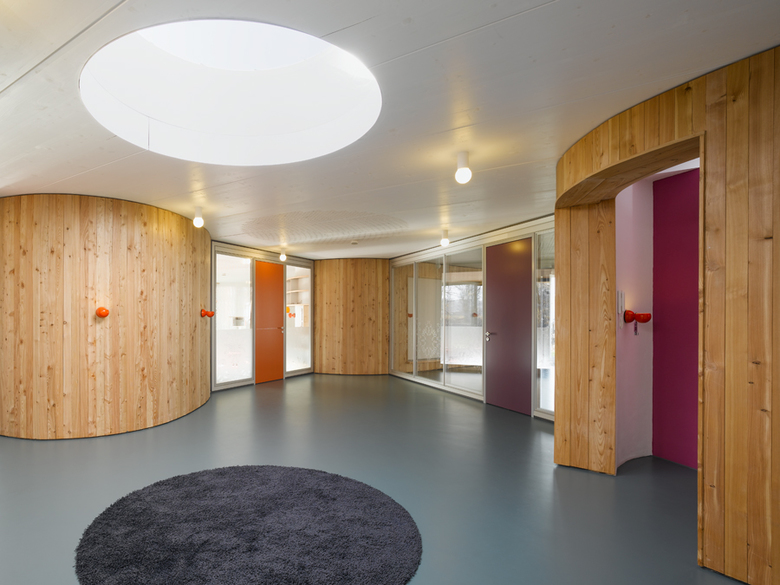 This daycare centre is dominated by flowing shapes. The curved exterior elements and their staggered arrangement create a variety of spaces in the interior – group rooms and rest rooms, for instance. In between, there is space for play groups, a multipurpose space and a Bobby Car area. The room volumes are arranged playfully and randomly beneath the amorphous lines of the roof slab. All materials were sourced locally, and recycled paper was used for insulation.