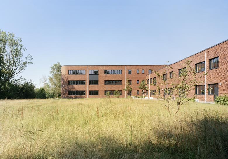 Der Neubau ist durch zwei L-förmige Baukörper geprägt, die vier unterschiedlich gestaltete Höfe entstehen lassen. Diese bieten Raum für verschiedene Nutzungen und verleihen der Schule eine klare, von außen erkennbare Struktur, die durch die Materialwahl und Farbgebung verstärkt wird.