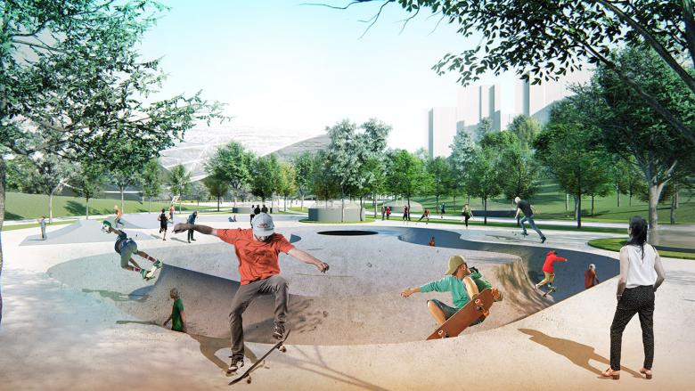 Using a zero-earth landscape strategy, the excavated earth from the restored wetlands and valley is re-used to create a rolling hillscape with porous pavement. These interventions turn the site into a “Sponge City” that collects, filters, and reuses rainwater for water features, irrigation, plumbing, heating and cooling. The park extends the activity of the city streets into the landscape to integrate the much-needed green heart to the area, strengthens and diversifies the ecology its entire context, and creates a new center of public life in Hangzhou that will be used long after the Games end. The design is well-equipped to house activities like nature walks, basketball and skateboarding, shopping, picnics, waterfront dining, community events, and more.