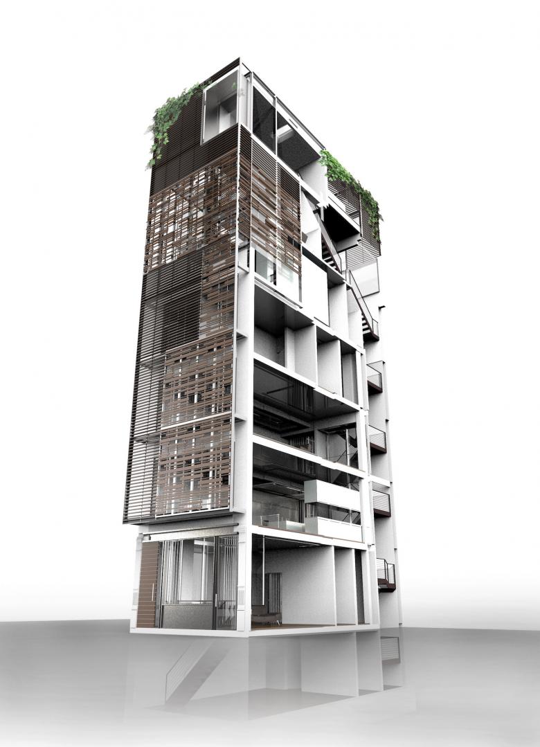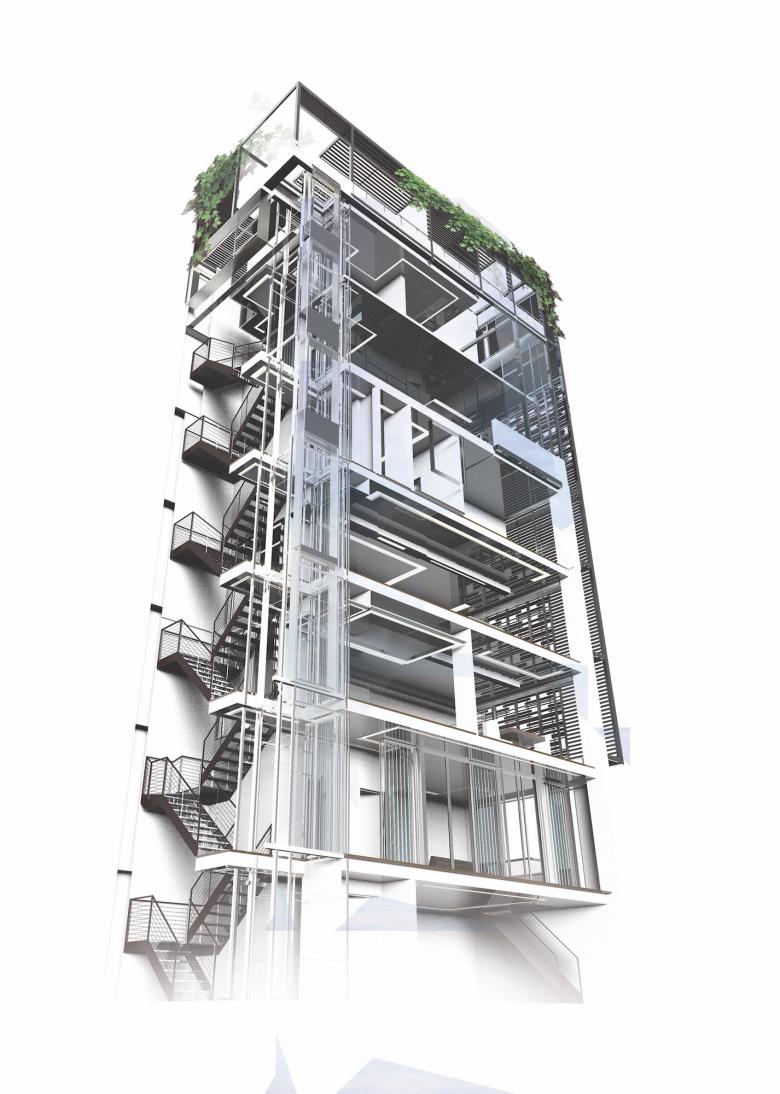 By adding a large extension onto an existing building with a modest footprint of 19 x 40 feet, we converted the building into an 8-story townhouse for 1 family, wrapped by a spacious lattice envelope functioning as a climatic skin, a third ‘building’.