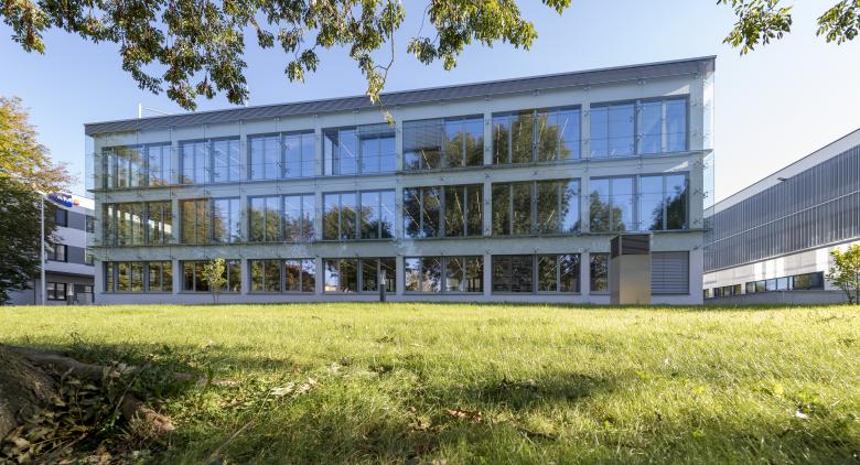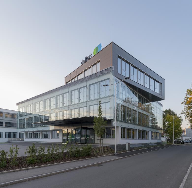 Der horizontal gegliederte Baukörper transportiert gestalterisch die Idee von „gestapeltem“ Papier, was eine symbolische Anlehnung an die Produkte der Nutzer ist. Das Atrium bildet einen Orientierungspunkt und die grüne