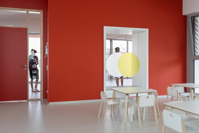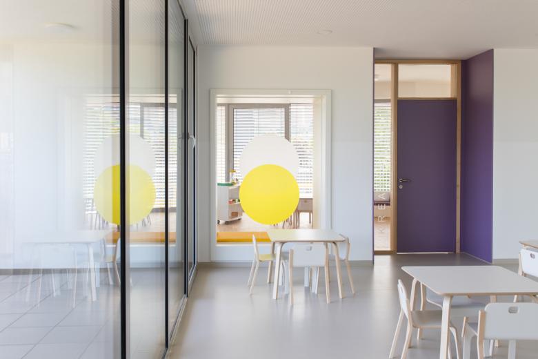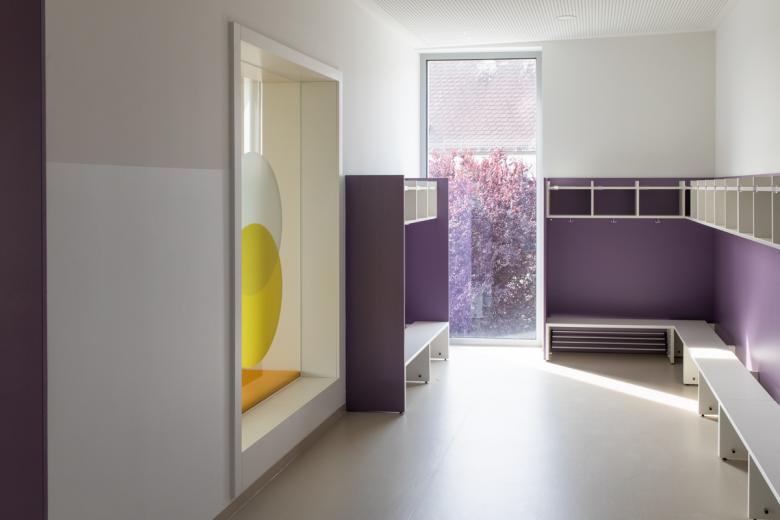 Als Inspiration für den neuen Baukörper dient ein Windrad – dessen Flügel sich in alle Richtungen ausbreiten – und ein lichtes luftiges Gebilde ausformulieren. Die Geometrie des Windrades wurde aufgebrochen und spielerisch neu zusammengesetzt. Durch die dreieckigen Fassadenrücksprünge ergibt sich eine zusätzliche Raumqualität die Innen- und Aussenräume für jeden Gruppenraum verbindet. In der Mitte befinden sich ein heller offener Luftraum und ein Marktplatz, der durch seine Ausformulierung vielfältige Rückzugs und Bewegungszonen bietet. Rundum angeordnet sind die Gruppenräume und Bewegungsräume mit toller Aussicht von innen nach außen und eine gute Orientierung ist gewährleistet! Im zentralen Innenraum des Gebäudes sieht man von jedem Punkt aus in alle Himmelsrichtungen. Farben heben die Funktionen der Kinderbetreuungseinrichtung – Krabbelgruppe, Kindergartengruppe, Bewegungsraum – hervor, sowohl im Innenraum als auch an den Fassaden. Somit sind Akzente im Gebäude gesetzt, die