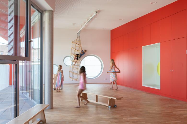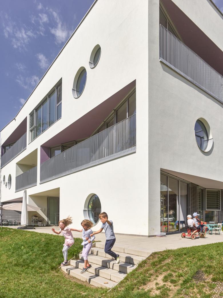 Der Freiraum übersetzt die Formensprache der Architektur und verschneidet diese mit der bestehenden Situation. Durch die den Gruppenräumen zugeordneten Loggien, wird in allen Geschossen der Freiraum direkt mit dem Innenraum verschmolzen. Grünflächen und akzentuierte Beläge gliedern spezielle Funktionen wie Spiel- und Aufenthaltsmöglichkeiten und befinden sich an strategischen Punkten (Einsicht, Lärm- und Schallschutz). Bestehende Geländeböschungen werden zum Rutschen in allen Jahreszeiten genutzt. Der Baumbestand wird aufgenommen und weitgehend erhalten. Die Dachbegrünung trägt zusätzlich zur gestalterischen Einbindung in den Grünraum bei. Anregende, nachhaltige und angenehme Kinderbildungsräume (als 3.Pädagoge) für alle Kinder zu errichten, versteht sich als eine der Kernkompetenzen von Architekt*innen. Es ist unsere Aufgabe, dafür immer wieder neue Lösungen zu entwickeln, um die optimalsten Bedingungen für ein soziales nachhaltiges Miteinander zu ermöglichen, die unseren Kindern beim guten Start ins Leben unterstützen!