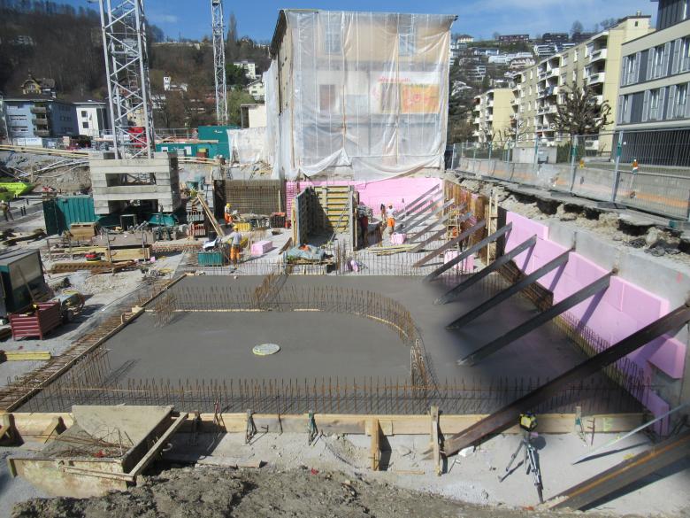 Um einen Teil der Gebäude möglichst nahe an der bestehenden Strasse realisieren zu können, musste eine Rühlwand erstellt werden. Diese dient der Baugrubensicherung sowie im Endzustand als Fundation für die Obergeschosse.