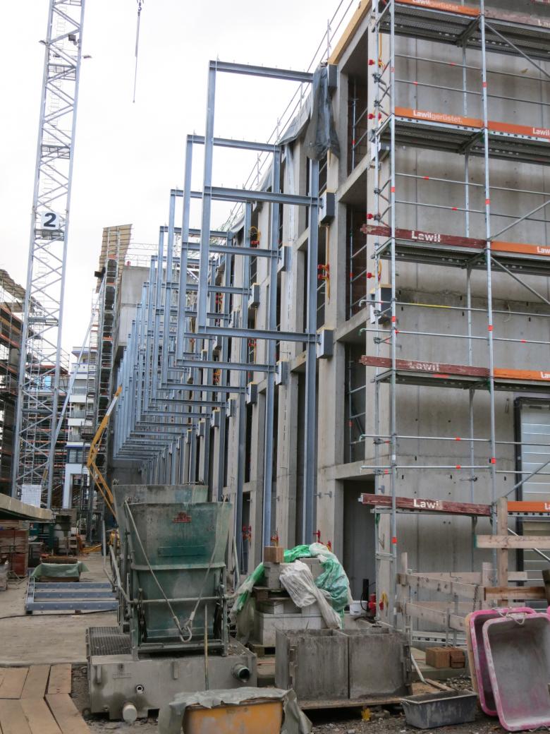 Die Neubauten teilen sich z.T. ein Untergeschoss mit Einstellhalle. Die bis zu 7-geschossigen Gebäude schliessen direkt an die erhaltenswerten Gebäudeteile an. Die Erschliessung erfolgt in den meisten Wohnungen via aussenliegende an der Fassade „schwebende“ und schallentkoppelte Laubengänge.