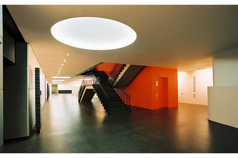 Das Foyer im Untergeschoss wird durch die angestrahlten Wände optisch geweitet. Runde Deckenausschnitte sind von weiß bis blau regelbar beleuchtet und simulieren somit Öffnungen zum Himmel. Auch hier wirkt die von Oben durchdringende orangenfarbene Wand als prägendes Verbindungsglied.